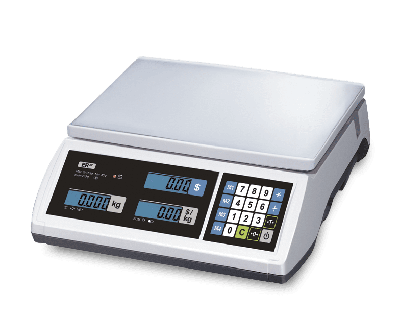 The ER Jr Pricing Scale is an affordable option ideal for small Fruit & Vegetable, Butcher and Grocery stores. The ER-Jr is simple and easy-to-use with 4 direct PLUs keys as well as open weight items. The ER-Jr has easy-to-read LCD displays with blue backlights and is available in both a pole version and bench version.